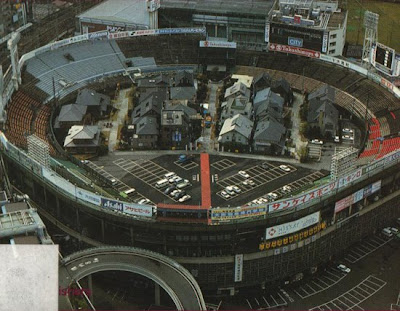 Japan, Osaka stadium, former home ground of baseball team Nankai Hawks. The stadium situated in center of Osaka City, with capacity of 31379 seats. In 1988, The Hawks' owner company sold the team to Daiei Group and moved to Fukuoka City. As 3 remaining teams in Metro Osaka got their own stadiums, Osaka stadium was abandoned for baseball and soon converted to sample housing showground. The stadium was demolished in 1998 and and shopping center is build on that location.
